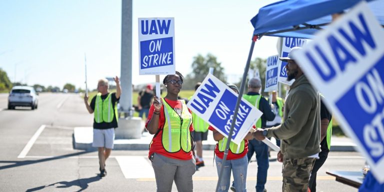 where workers at three plants have gone on strike. On Sunday, the president of the United Auto Workers (UAW) rejected Stellantis’s wage-hike offer of 21% with an immediate 10% increase at the time of approval. Ford was down 1.7% and Stellantis’ U.S.-based shares were down 1.6%.