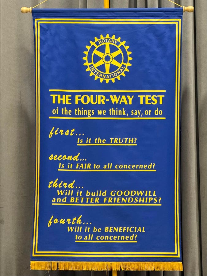 As if I needed further proof that these people were for real, every meeting is closed with a joint recitation of The Four-Way Test. Originally the brainchild of Rotarian Herbert J. Taylor, who used the Test to help turn around the Club Aluminum Products Company facing bankruptcy in 1932, Taylor gave Rotary the rights to use the test in 1942 and ultimately transferred the copyright. Here it is: